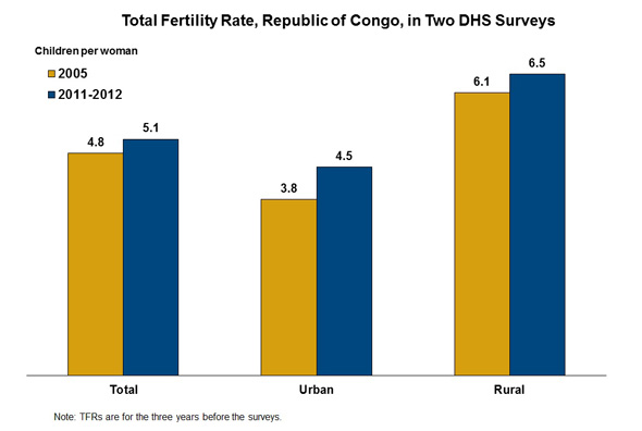 The Congo (Brazzaville) 2011-2012 Demographic and Health Survey (DHS) is the second DHS taken in the country and the preliminary report has just been released. The survey interviewed 10,819 women ages 15-49 and 5,145 men ages 15-59 from September 2011 to February 2012. A major finding of the survey was that fertility has not declined in the country since the previous DHS in 2005. The total fertility rate (TFR) report in the recent DHS for the three year period before the survey was 5.1 children per woman, 4.5 in urban areas, and 6.5 in rural areas. This appears to represent an increase in the TFR since 2005 but the survey report cautions that there is likely to have been some understatement of the actual level of childbearing in the 2005 survey, particularly among women ages 25-29.