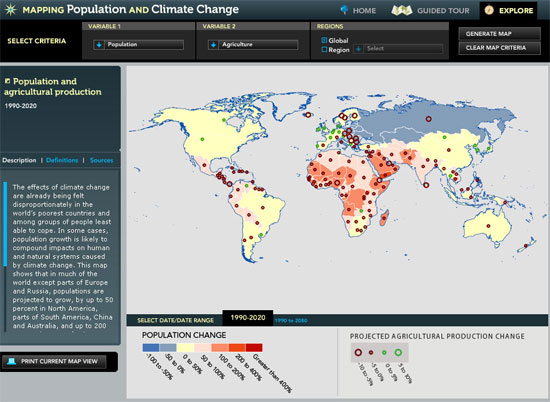 ›Climate change, population growth, unmet family planning needs, water scarcity, and changes in agricultural production are among the global challenges confronting governments and ordinary citizens in the 21st century. With the interactive feature “Mapping Population and Climate Change” from Population Action International, users can generate maps using a variety of variables to see how these challenges relate over time.