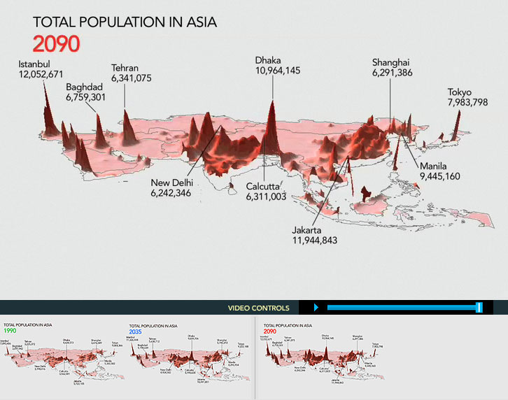 In addition, users can view three-dimensional maps of population growth in Africa and Asia for the years 1990, 2035, and 2090. These maps visually demonstrate the projected dramatic increases in population of these regions by the end of the century. According to the latest UN estimates, most of the world’s population growth will come from Africa and Asia due to persistently high fertility rates.