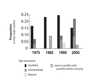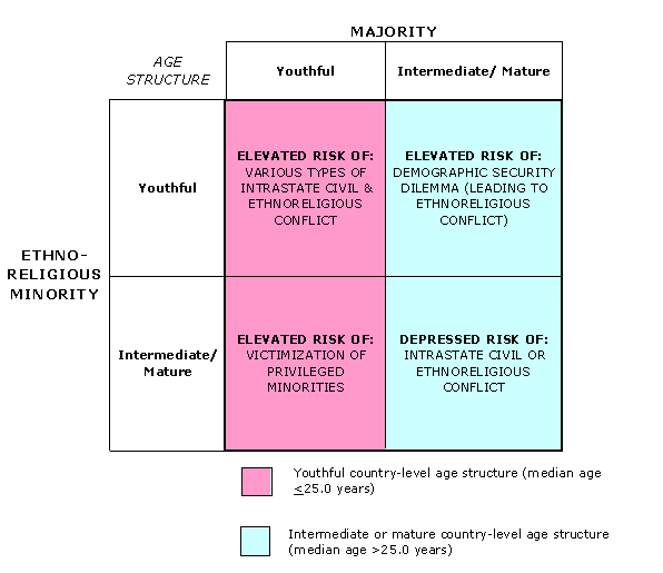 - Ethnoreligious conflicts have gradually, though noticeably, increased among a group of states with a median age greater than 25.0 years (including Thailand, Turkey, and Russia).