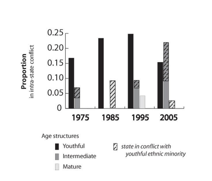 For political demographers, it may be time for a broader definition of demographically at-risk states, a definition that takes sub-national groups into account. This new description acknowledges that the youthful age structure of a politically organized minority is a significant risk factor for intrastate conflict. Whereas for now and the near future, the vast majority of intrastate conflicts will emerge within the so-called demographic arc of instability – a geographic swath of states having a population with a median age less than or equal to 25 years – the acknowledgment of this emerging trend suggests that analysts should look beyond country-level demographic data for telltale signs of minorities that sustain a youthful age structure.
