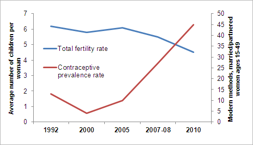 The strategy establishes a target of reducing total fertility rate to 4.5 children per woman by 2012 (which preliminary survey results for 2010 indicate has nearly been achieved). The strategy also sets a bold goal to increase the rate of use of modern contraceptives to 70 percent among women of reproductive age. In addition, the strategy focuses on raising the proportion of the population with access to health centers and to improving the breadth of health care services offered at such facilities.