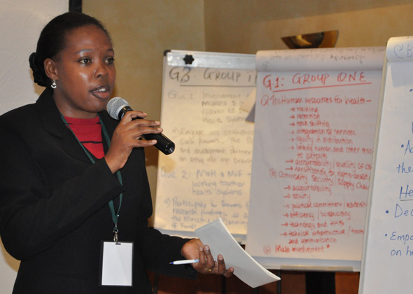 James Wariero, a regional health advisor with the MDG Centre for East and South Africa, served as the representative for the group discussing the “diagonal approach,” which focused on how maternal health indicators can best set priorities to improve the overall health system. They identified antenatal care visits as a priority because they also serve as an entry point to other health services, including HIV/AIDS treatment.