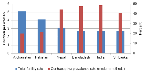 Why are these indicators closer than might be expected? Relative to the other countries in South Asia, Pakistan has had considerably less success in promoting family planning use. Bangladesh has a per capita income about half that of India and one-quarter that of Sri Lanka, yet the three countries’ fertility rates are identical. Nepal has the lowest income in the region – even slightly below Afghanistan – yet more than 40 percent of married women use modern contraception and fertility is three children per woman. And then there is Pakistan. Despite a per capita income 90 percent that of India, only 22 percent of married women use modern contraception and fertility remains persistently high at over four children per woman.