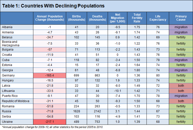 In 2010, a total of 19 countries experienced a decline of at least 1,000 people in their population compared to 2009 (Table 1). All of them, except Cuba and Puerto Rico, are located in Eastern and Southern Europe. In 11 of the 19, low fertility is the primary cause of decline, as annual deaths surpass births. In five countries, including the two in the Caribbean, there are still more births than deaths, but high outward migration rates create population decline. The remaining three unlucky countries – Latvia, Lithuania, and Moldova – are facing both natural declines, as deaths exceed births, and high rates of out-migration.