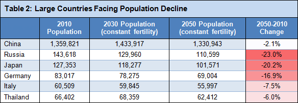 By 2030, the number of countries experiencing population decline is projected to increase from 19 to 34. The geographic scope of decline will broaden beyond Eastern and Southern Europe, incorporating China, Japan, Thailand, Italy, Greece, and Spain. Table 2 shows projected populations for 2030 and 2050 in large countries facing population decline, assuming that current fertility rates stay constant. (The more widely cited medium-fertility variant assumes that low fertility rates will rebound back to replacement level, which is not supported by recent trends in these countries.) The potential declines in Japan and Russia are most dramatic; both have current fertility rates below 1.5 children per woman.