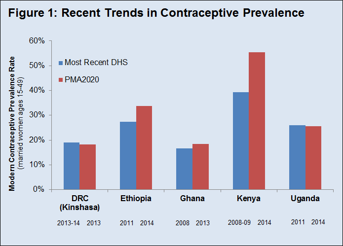There has been only one opportunity to cross-check results between the two surveys so far, and the DHS and PMA2020 results for Kinshasa are quite similar. New DHS surveys are forthcoming in Ghana and Kenya, with preliminary results expected in early 2015. The wait will be longer in Ethiopia and Uganda. If the typical five-year interval is maintained, new DHS results are not likely to be available until 2017, by which time each country will have been through several additional rounds of PMA2020.