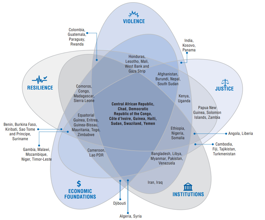 The authors use a Venn diagram to indicate which of the five dimensions of fragility the most vulnerable countries are associated with.