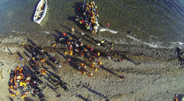 Photo Credit: Aerial image from above with Syrian migrants/refugees as they arrive from Turkey on a boat near Molyvos, Greece, courtesy of Nicolas Economou/Shutterstock.com.