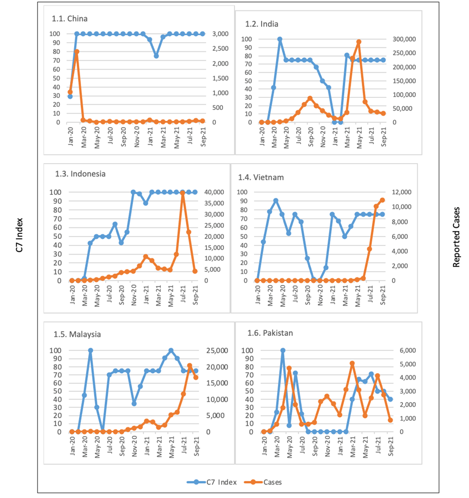 In India and Pakistan, the complete withdrawal of internal mobility restrictions in January-February 2021 and in August 2020-February 2021 respectively resulted in the two states experiencing their highest monthly average of daily new cases shortly after, providing some support for the effectiveness of strict domestic mobility restrictions as a containment policy (Fig 1.2 and 1.6). But in Indonesia, Malaysia, and Vietnam, the relaxation of mobility restrictions did not coincide with a higher number of cases; in fact, in these three countries, the number of COVID cases ultimately peaked as mobility restrictions reached their maximum (Indonesia) or remained very high (Malaysia and Vietnam) (Fig. 1.3; 1.4; and 1.5).