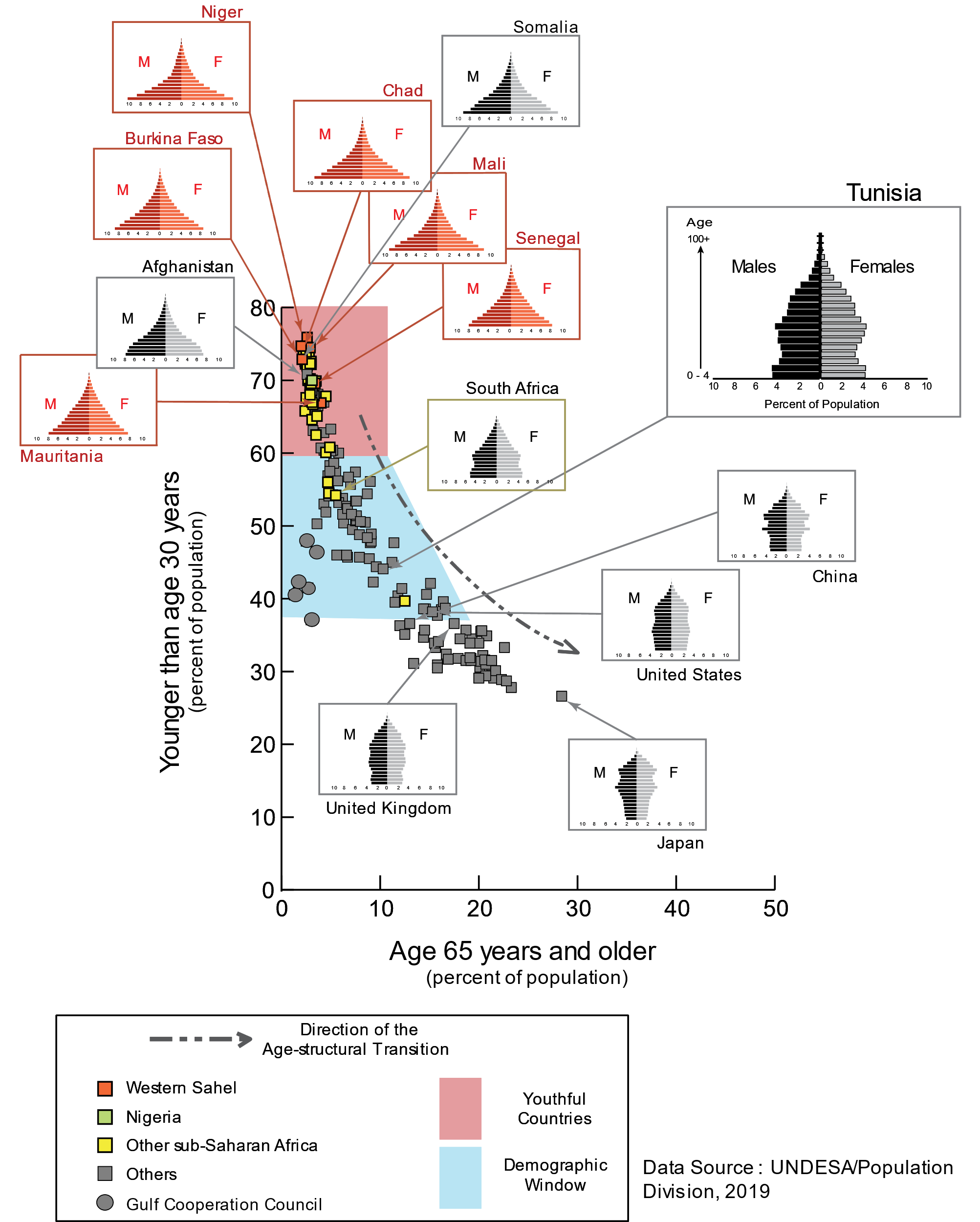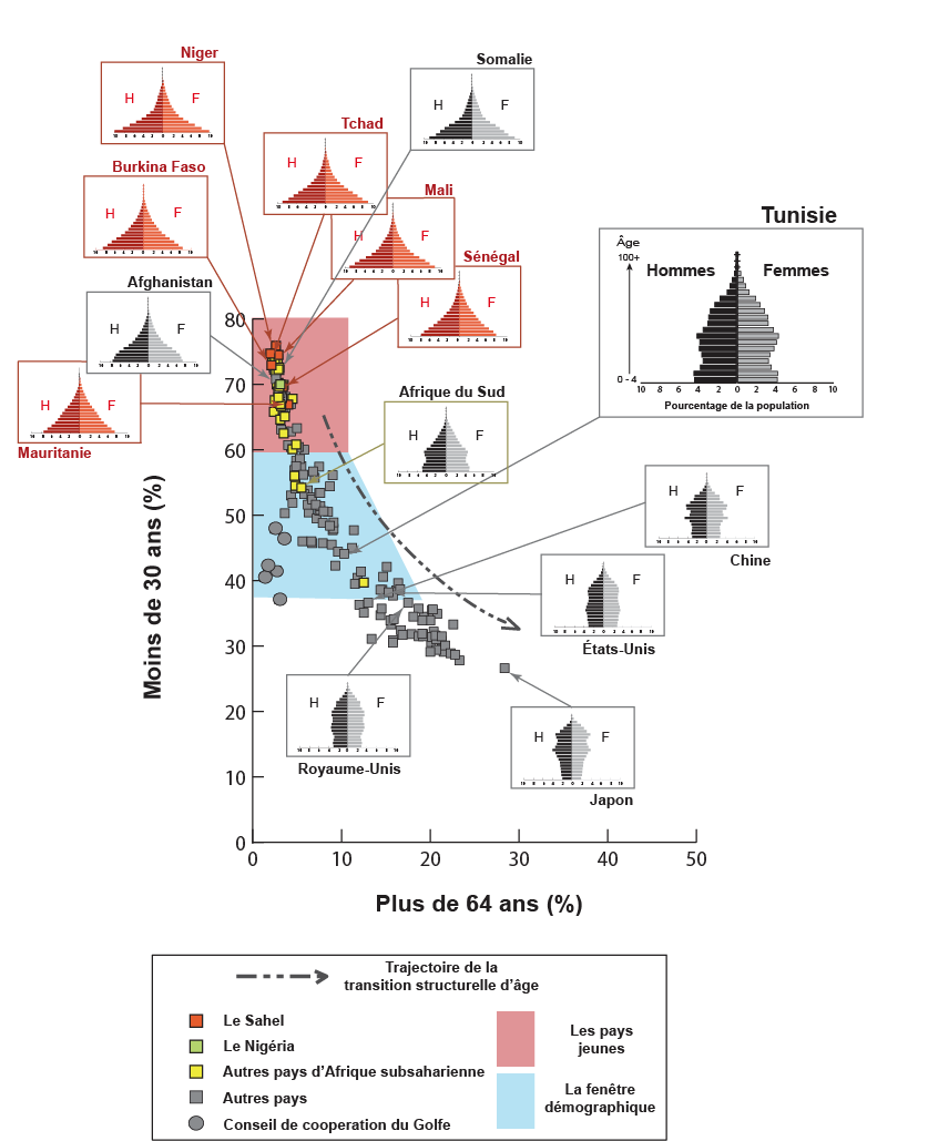 Figure 1. Les six pays du Sahel occidental (en rouge) le long du chemin des transitions âge-structure, 2020 (Notez les positions de la Somalie et de l’Afghanistan)