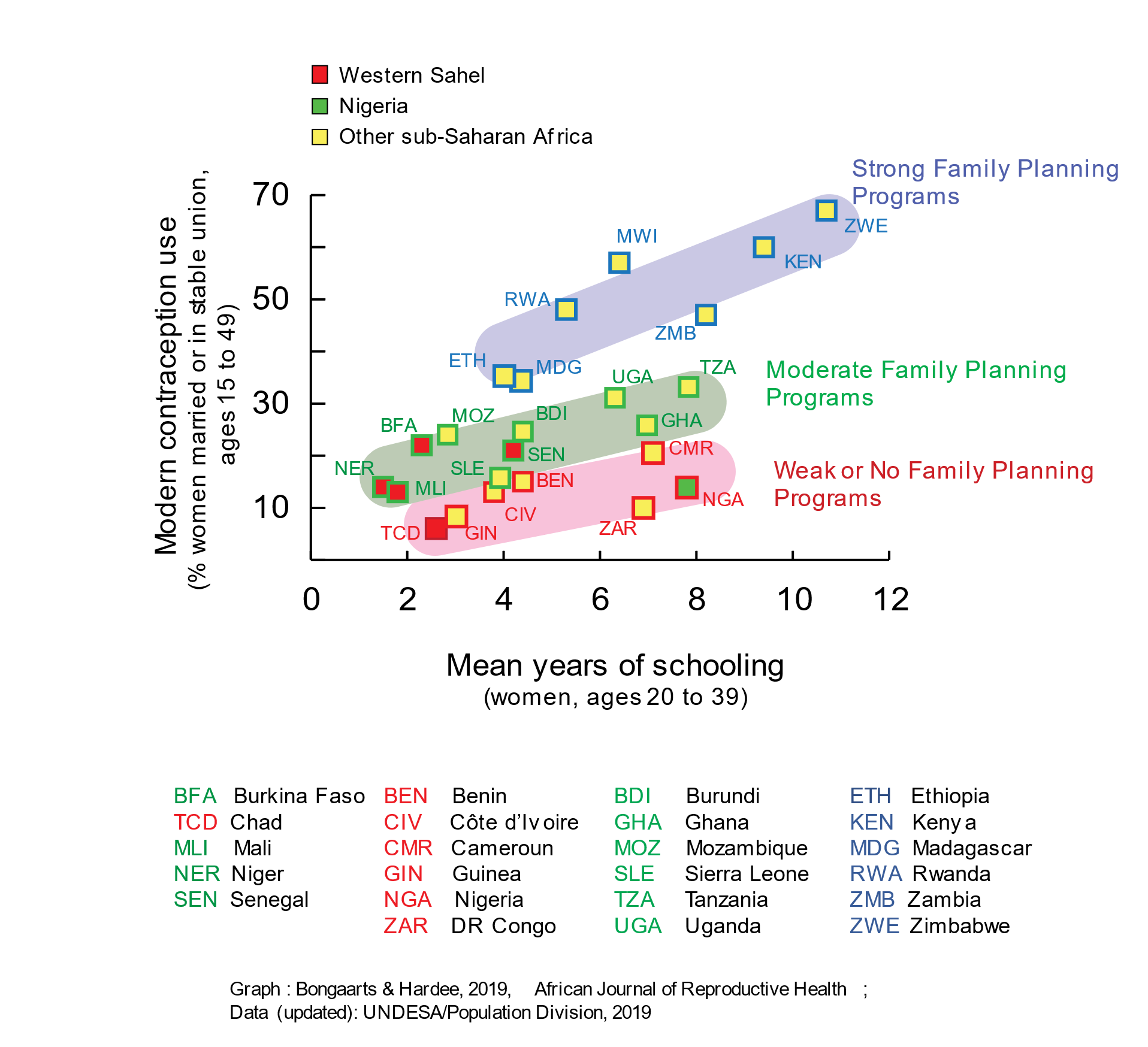 The combined effects of high levels of both girls’ educational attainment and the work of voluntary family planning programs have already increased modern contraceptive use in sub-Saharan Africa (Figure 4, updated from Bongaarts & Hardee, African Journal of Reproductive Health, 2019). However, in the Western Sahel, relatively low levels of female educational attainment are accompanied by moderate or weak family planning programs.
