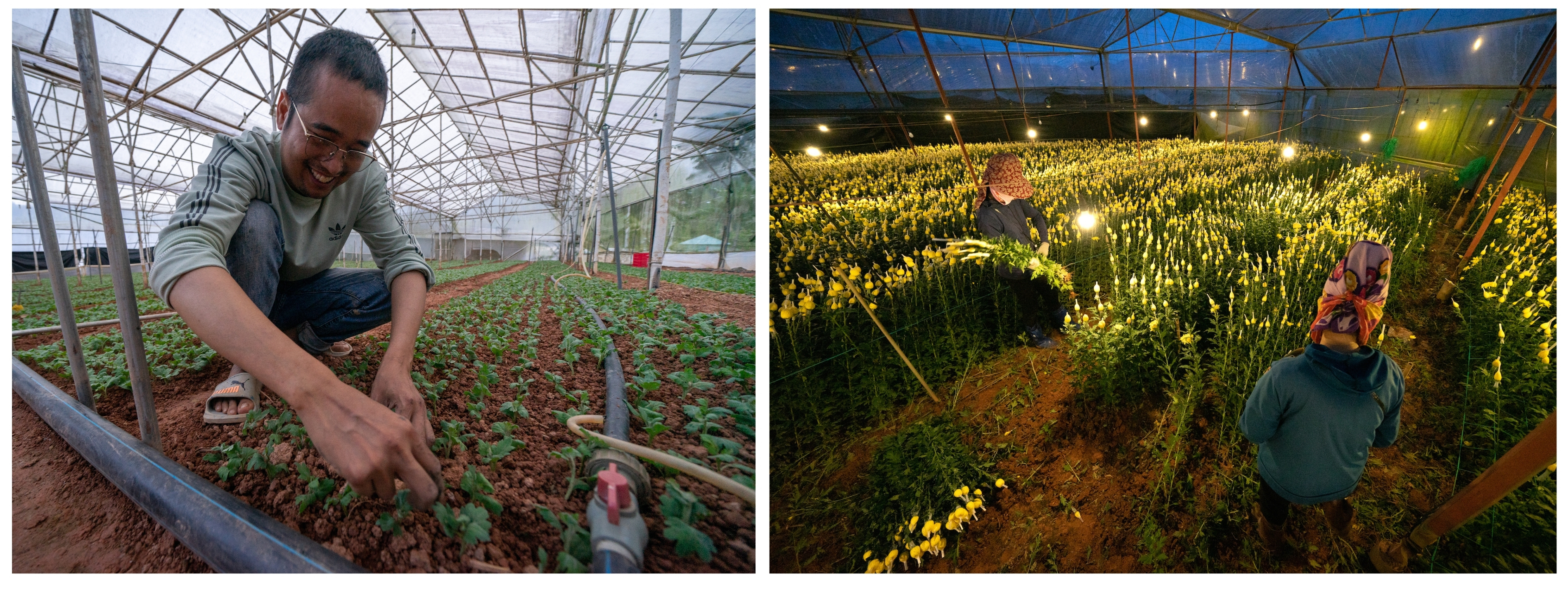 While greenhouses are expensive, they are a “mark of achievement” for many farmers, often leading to higher yields and acting as a “safety net against climate change”, says Nguyễn Châu Bảo, co-founder of Act Now, a Dalat-based environmental nonprofit. With increasingly unpredictable weather patterns in the region, greenhouses allow farmers to control the environment and shield crops from harsh conditions. Plastic sheeting allows nonnative plants, like tomatoes, to be grown all year, protected from heavy rains, humidity, hail and frost. Heavy downpours can cause roots to become waterlogged, split tomato skins, and lead to bacterial infections in the plant. For this reason, the majority of tomatoes are grown inside greenhouses in Dalat.