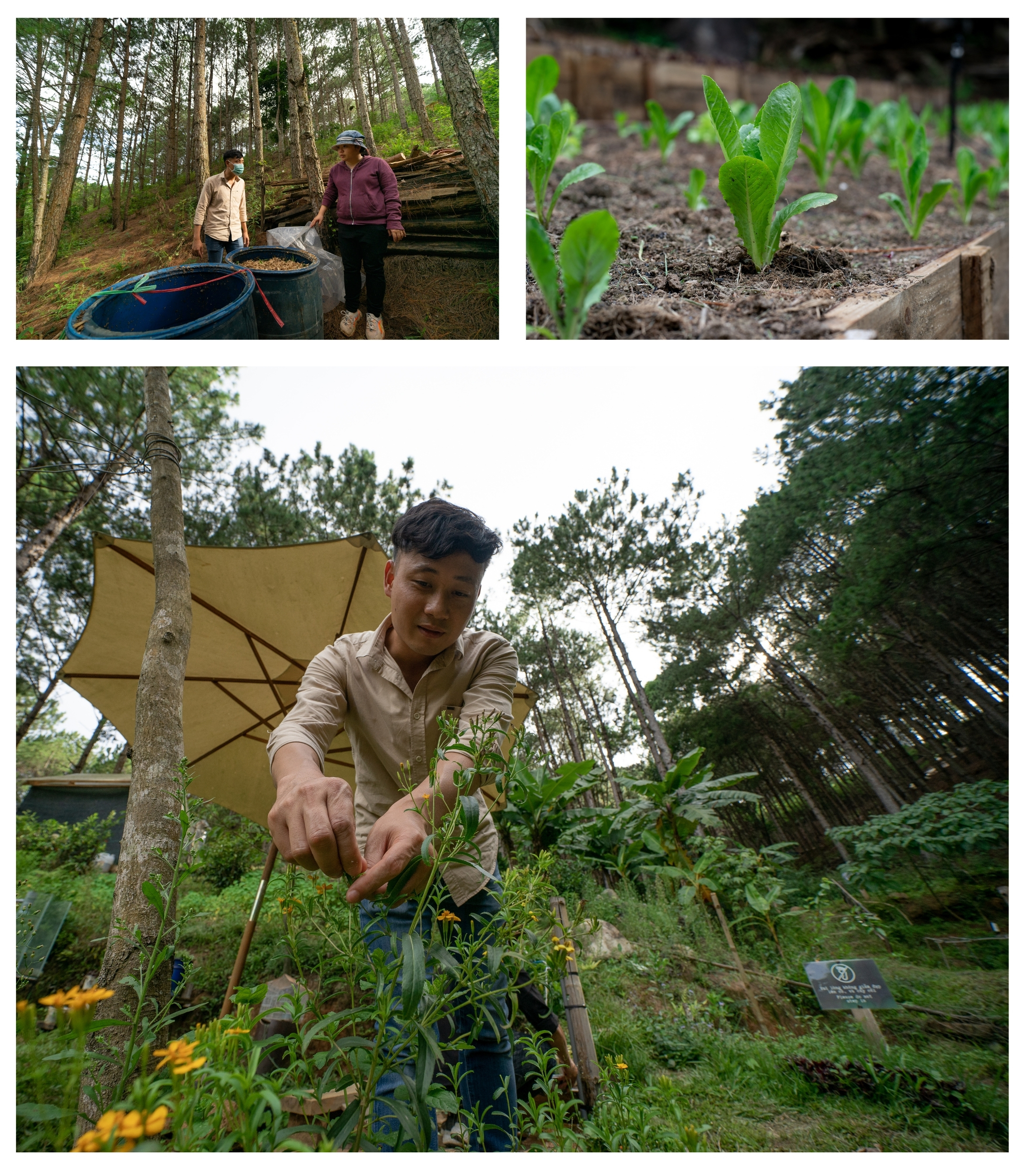 Rừng Thông Mơ has no plastic greenhouses. Instead, herbs and green leafy vegetables are grown using intercropping methods, and rice husks are burnt to deter pests. The farm produces little to no plastic waste, avoiding the harmful impact agri-plastics can have on soil health.
