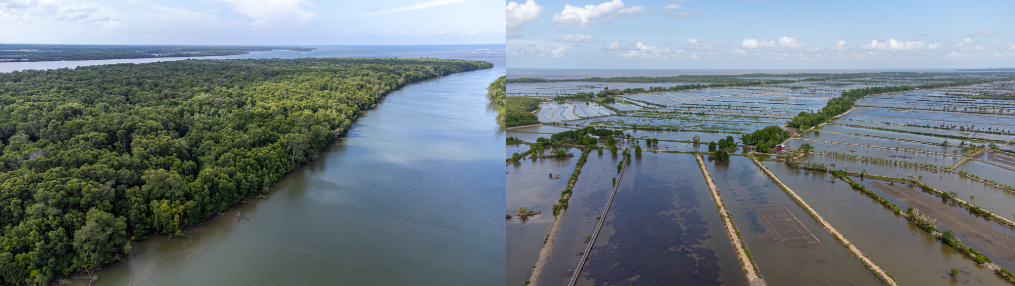 Right image: Today, around half of those forests have been replaced by aquaculture pondsIn response, several mangrove restoration programs were launched by the Indonesian government, with a major reforestation project first announced in 2000, “but the expected outcome was not achieved.”