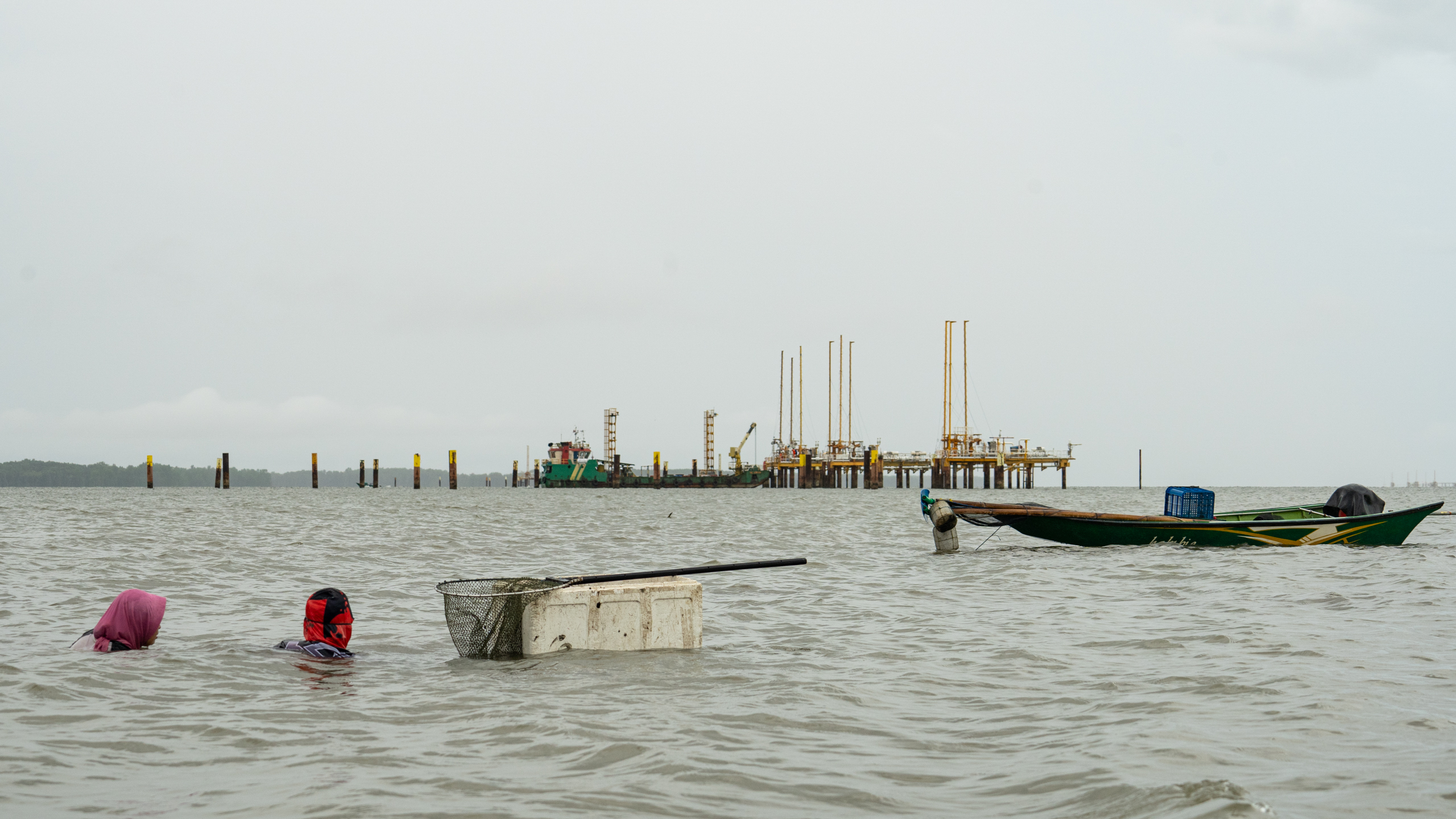 Bagas, Tani Baru village secretary, is joined by his wife, as they hunt for blood clams near a gas well