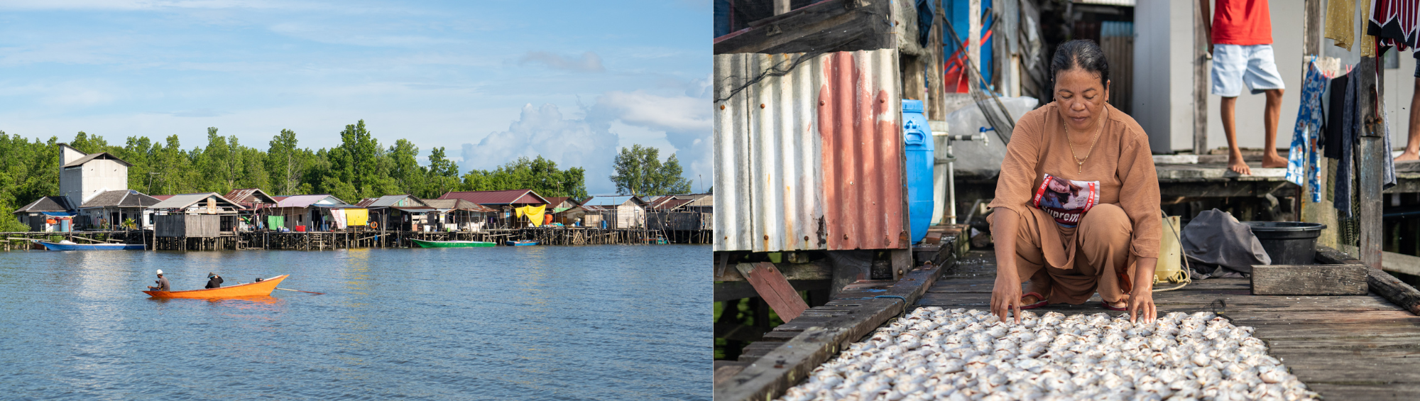 Right image: While areas around the village have been converted to aquaculture ponds, many residents still benefit from the fish they can catch in the river and at sea, thanks to the breeding grounds provided by the mangroves