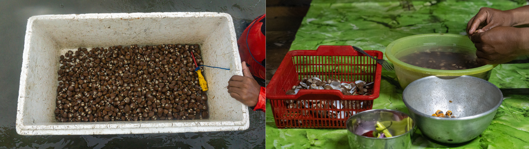 Left image: They can sell the clams for USD 1.50 a kilo, a useful addition to the family income