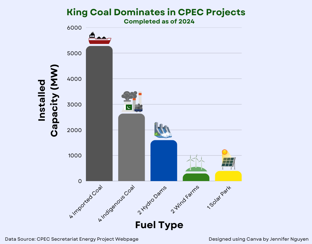 Power sector investment was a key focus when CPEC launched in 2013. Fully 14 power generation projects (9,000 MW) valued over $15 billion were built by 2024, and over 70% of them were coal-fired—with more than half relying on imported coal.