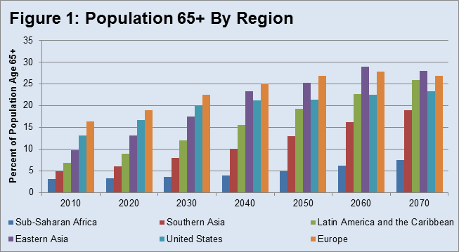 ›September 10, 2013 // By Elizabeth Leahy MadsenPopulation aging and decline are frequently described as a threat to countries’ economic development and social stability. Evocative language, such as “demographic winter” and “graying of the great powers,” portrays the serious consequences that many observers envision as fertility and growth rates decline and the elderly comprise a greater percentage of the population. These concerns reach around the globe, including in Africa, which has the lowest percentage of elderly among the world’s major regions.