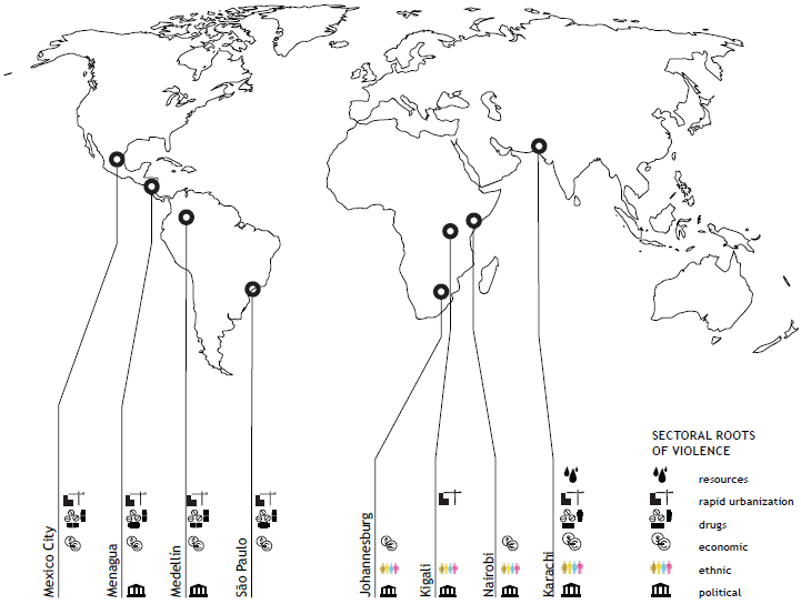 To do this, Davis and Tirman focused their research on seven cities around the world with histories of chronic violence, creating a case study for each and then comparing results. (An eighth city, Karachi, was jettisoned because it was deemed too unsafe for research.) The comparative process allowed Davis and Tirman to develop a basic theoretical framework for how different factors increase or decrease a community’s resilience to violence.
