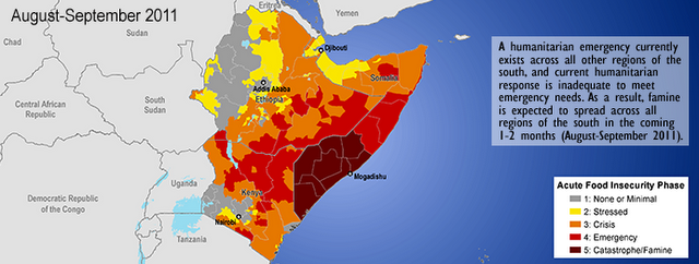 For those who doubt this, look at the Famine Early Warning System Network (FEWS NET) maps I put in previous posts here and here (Editor: also above). Famine stops at the Somali border. I assure you this is not a political manipulation of the data – it is the data we have. Basically, the people without a functional state and collapsing markets are being hit much harder than their counterparts in Ethiopia and Kenya, even though everyone is affected by the same bad rains, and the livelihoods of those in Somalia are not all that different than those across the borders in Ethiopia and Kenya. Rainfall is not the controlling variable for this differential outcome, because rainfall is not really variable across these borders where Ethiopia, Kenya, and Somalia meet.