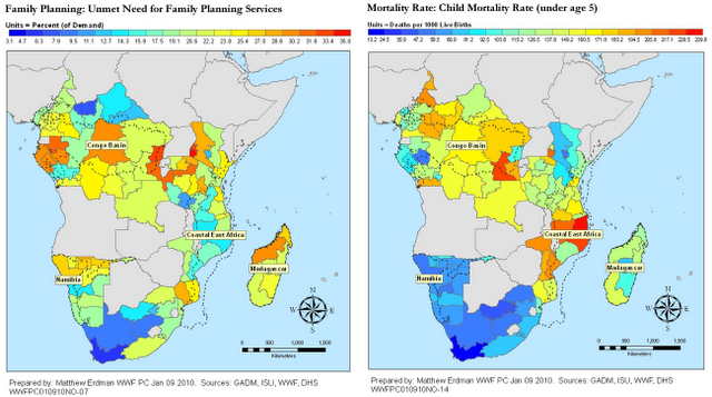 Image Credit:“Family Planning: Unmet Need for Family Planning Services” and “Mortality Rate: Child Mortality Rate (Under Age 5)” courtesy of World Wildlife Fund.